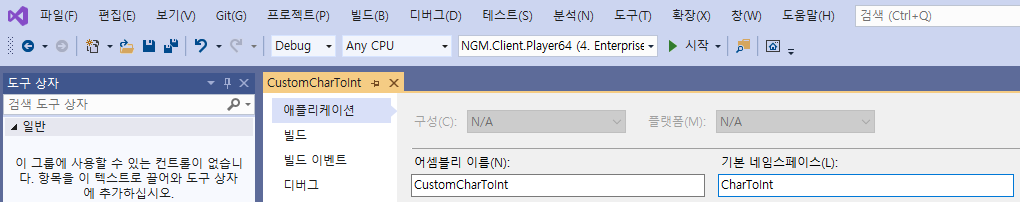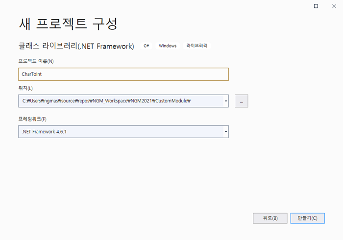 프로젝트 이름은 사용자가 임의로 만들어도 됩니다. 저는 직관적인 이름인 "CustomImageConditionModule"로 지었습니다. 위치는 원하는 곳을 지정하고, 프레임워크는 4.6.1 이상으로 선택하세요. 아래 그림에서는 "ChartToInt"로 되어 있지만, 무시하고 "CustomImageConditionModule"이라고 프로젝트 이름에 입력하세요.