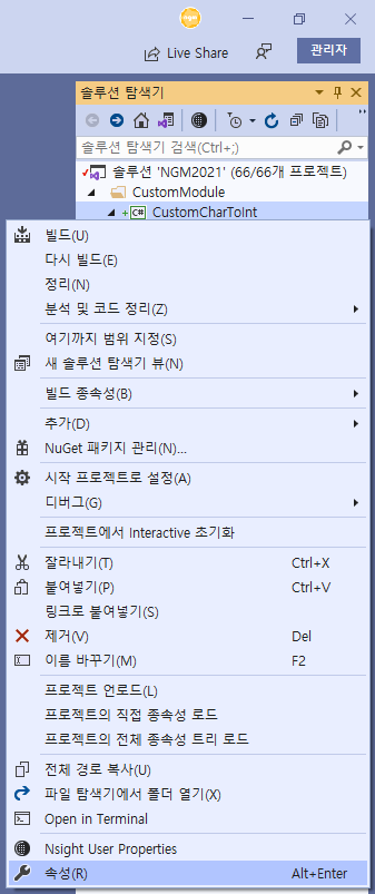 위에서도 언급했듯이 커스텀 모듈은 2가지 네이밍룰이 존재합니다. 프로젝트명은 Custom으로 시작해야 하고, 엔지엠 에디터에 액션으로 표시되는 클래스는 이름이 Model로 끝나야 합니다. 이는, 엔지엠 에디터가 수용할 수 있는 커스텀 모듈인지 체크하는 최소한의 안전 장치입니다. 이외에도 몇가지 더 존재하지만, 개발하는데 중요한 내용은 아니므로 자세한 설명은 건너뛰도록 하겠습니다. 프로젝트를 선택하고, 우클릭 후 속성을 클릭하세요.