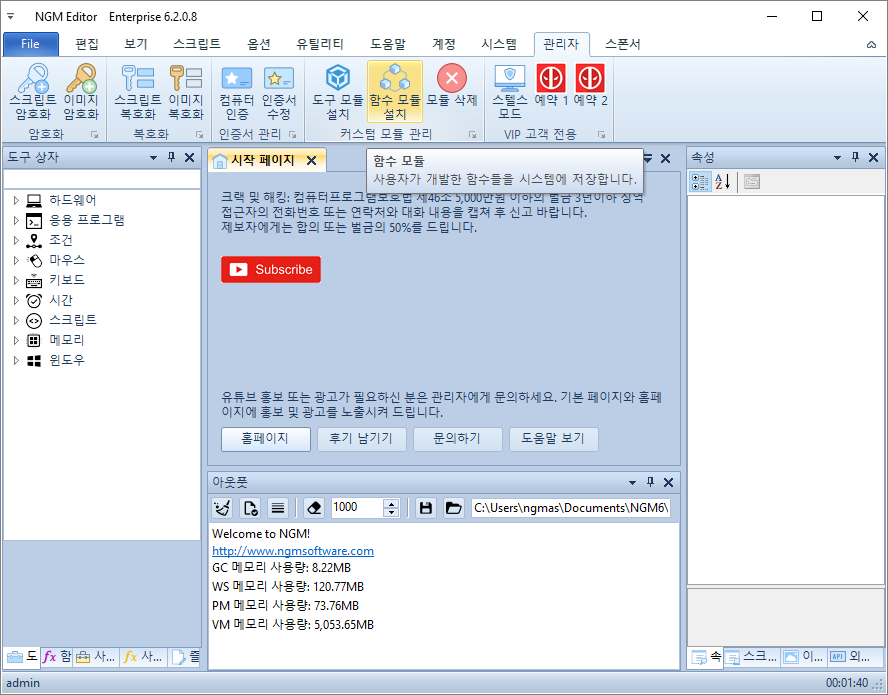 엔지엠 에디터를 실행한 후 "관리자" 메뉴의 "도구 모듈 설치" 버튼을 클릭하세요. (아래 그림은 함수 모듈 설치지만, 도구 모듈 설치로 해야 합니다.)