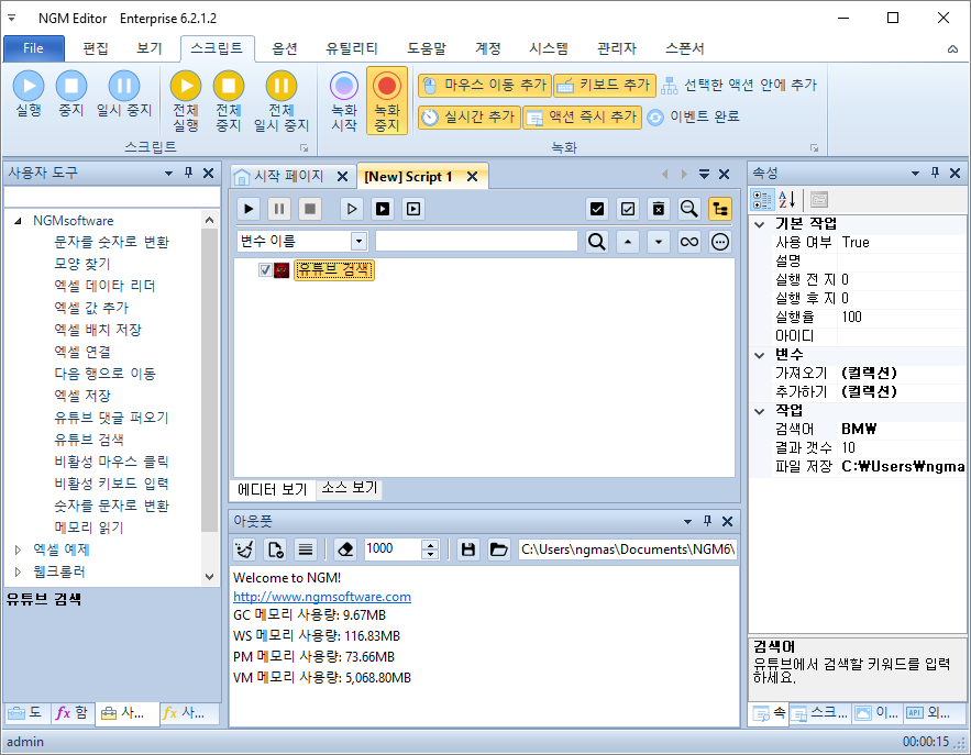 안녕하세요. 엔지엠소프트웨어입니다. 이전 시간에 알아봤던 [ 유튜브 댓글 수집기 ]를 조금 수정하면 키워드 검색으로 조회수를 늘릴 수 있습니다. 커스텀 모듈을 사용하면 엔지엠 RPA 매크로의 기능을 사용하면서 추가적인 확장 액션을 만들 수 있습니다. 커스텀 모듈은 엔지엠 RPA 매크로에서 기본 제공되는 액션의 기능을 확장하거나 고유한 업무를 처리하는데 특화된 모듈을 만들 수 있습니다. 기존 스크립트에 커스텀 액션을 추가하여 좀 더 효율적이고 구현하기 어려운 기능을 직접 만들어서 사용할 수 있습니다. 다만, 어느정도 C# 프로그래밍 언어에 대한 이해가 필요하고 엔지엠소프트웨어에서 제공해주는 커스텀 모듈 만들기 가이드를 이해하고 코드를 분석할 수 있어야 합니다.