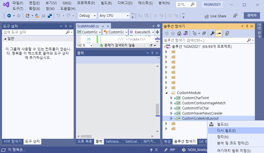 CustomGoogleAPI 프로젝트를 컴파일하세요. 아래 그림과 같이 프로젝트에서 우클릭 후 "다시 빌드"를 클릭하시면 됩니다.
