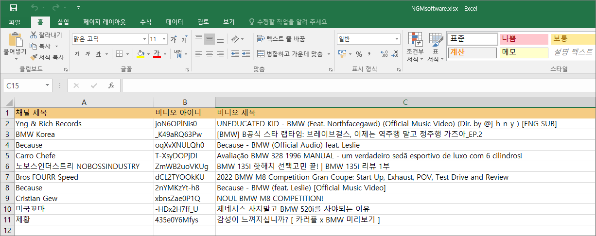 스크립트를 실행하고, 바탕화면에 만들어진 NGMsoftware.xlsx 파일을 열어보세요. 아래 그림과 같이 검색된 유튜브 채널의 정보를 확인할 수 있습니다. 소스를 보면 중간에 검색된 채널의 조회수를 늘려주는 부분은 주석으로 막아두었습니다. 주석을 풀면 검색된 동영상이 자동으로 실행되고 조회수가 올라갑니다. 추가적으로 아이피를 변경할 수 있는 VPN과 같이 사용해야 효과를 볼 수 있겠죠?
