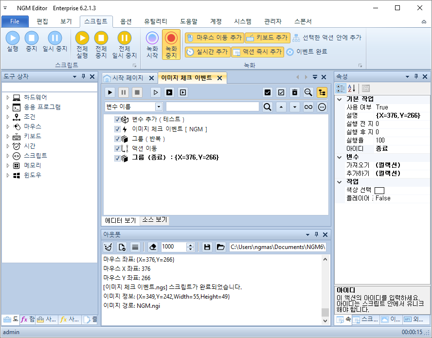 이벤트도 액션과 동일하게 변수를 사용할 수 있습니다. 다만, 이벤트가 발생한 시점에 변수에 값을 넣어주고 이동한 액션 아이디에서 이 값을 사용할 수 있습니다. 변수를 사용하기 위해 아래 그림과 같이 변수를 하나 추가하고, 이미지 체크 이벤트에서 이미지의 마우스 좌표를 변수에 저장해줍니다.