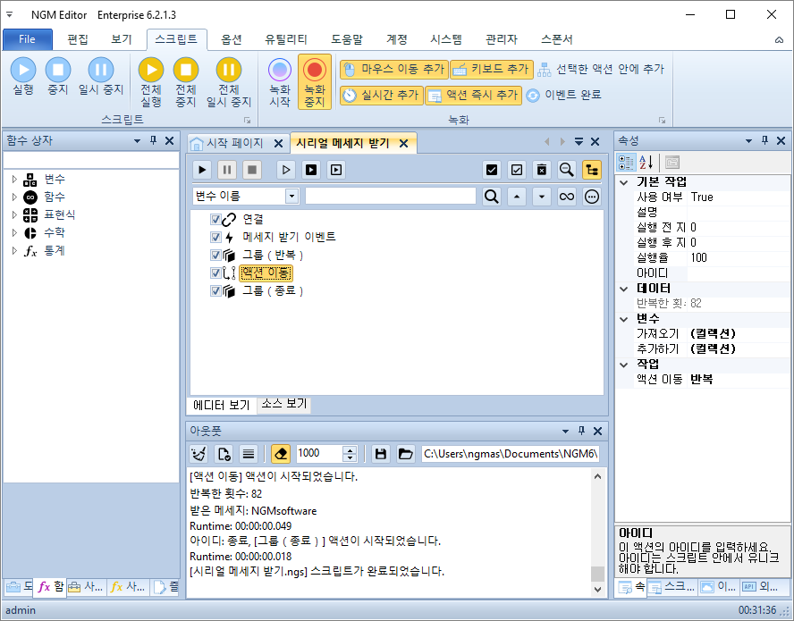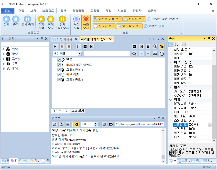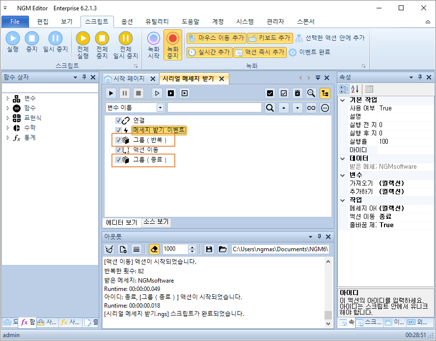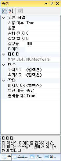 - 우측 외부 API 탭 > 시리얼 통신 > 메세지 받기 이벤트를 스크립트에 추가