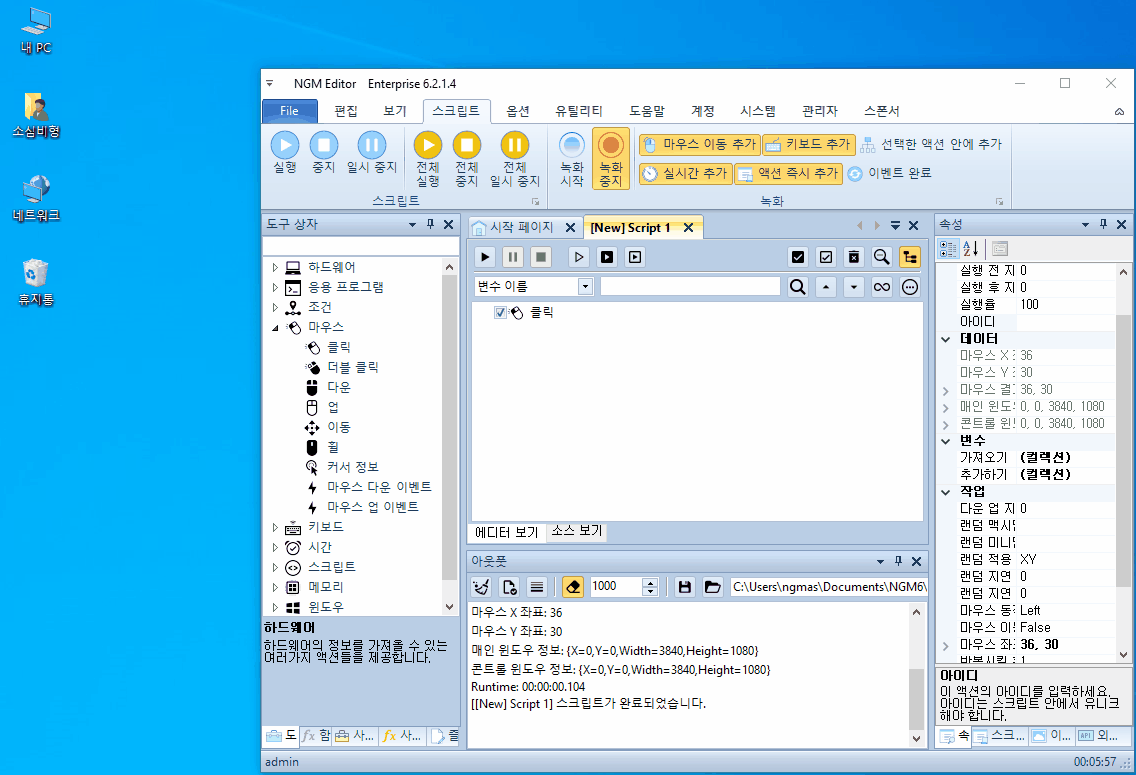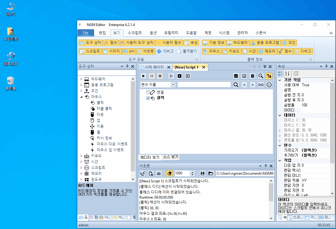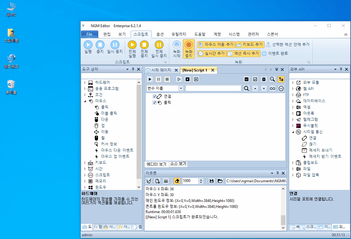 업로드 완료 후, 스크립트에 [연결] 액션을 추가하면 모든 마우스 클릭과 키보드 입력이 자동으로 하드웨어 신호로 변환됩니다.