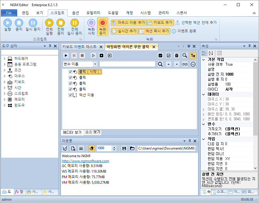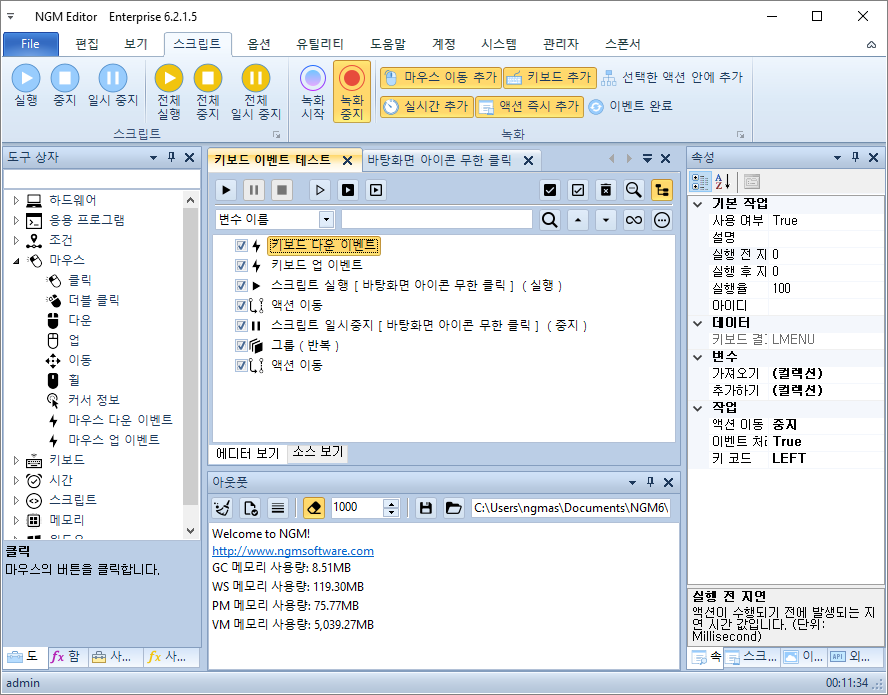 이벤트는 여러개를 등록할 수 있으니 잘 사용하면 액션으로 마우스와 키보드 상태를 체크하는 것보다 더 쉽게 원하는 기능을 만들 수 있습니다. 이벤트를 사용하려면 엔지엠 엔터프라이즈 버전이 필요하고, 6.2.1.5 버전 이상부터 정상 동작합니다.