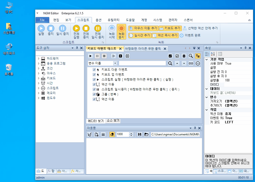 테스트를 위해 엔지엠 에디터를 실행하고, 새로운 스크립트를 추가 해줍니다. 그리고, 무한 반복할 스크립트를 하나 만듭니다. 스크립트 구성은 아래 그림과 같습니다. 각각의 클릭 액션은 바탕화면의 아이콘을 1초 간격으로 클릭합니다. 무한 반복을 위해 첫번째 클릭의 아이디는 "시작"이고 [ 액션 이동 ] 액션에서 "시작"으로 이동합니다. 이 스크립트는 "바탕화면 아이콘 무한 클릭.ngs" 으로 첨부되어 있으니 다운로드 후 열어보시면 됩니다.