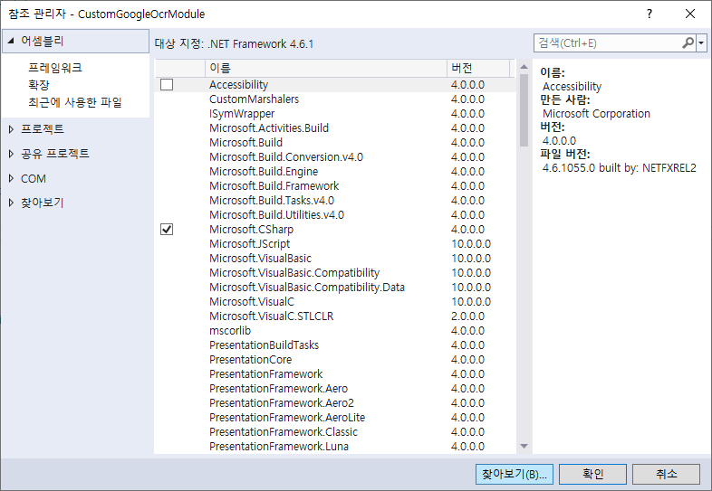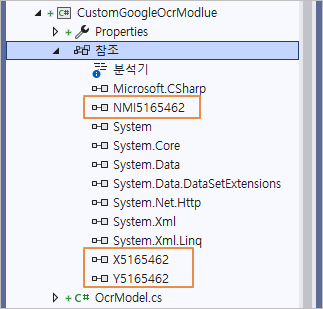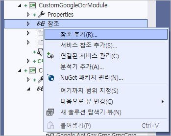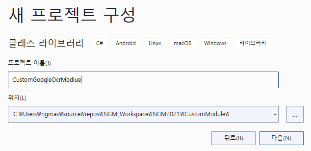 자~ 커스텀 모듈을 개발하기 위한 준비를 해야 하는데요. [ 커스텀 모듈 제작 도움말 ]이 있으니 참고하셔서 기본적인건 미리 준비해주세요. Visual Studio를 실행하고, 커스텀 모듈을 하나 추가 해줍니다. 저는 아래와 같이 CustomGoogleOcrModule로 이름을 지었습니다.