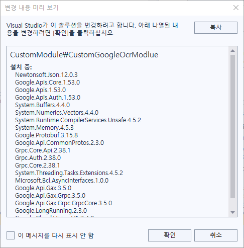 변경 내용 미리 보기에서 어떤것들이 설치되는지 확인하고, "확인"을 누르세요.
