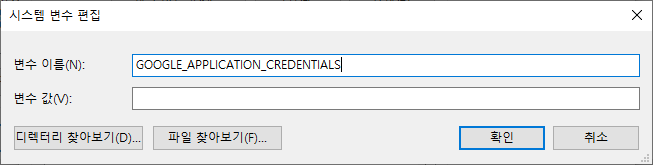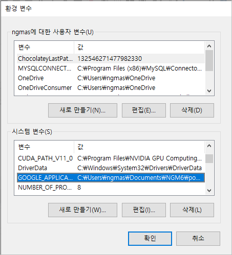 하단의 시스템 변수에 "GOOGLE_APPLICATION_CREDENTIALS"이 등록되어 있는지 확인하세요.