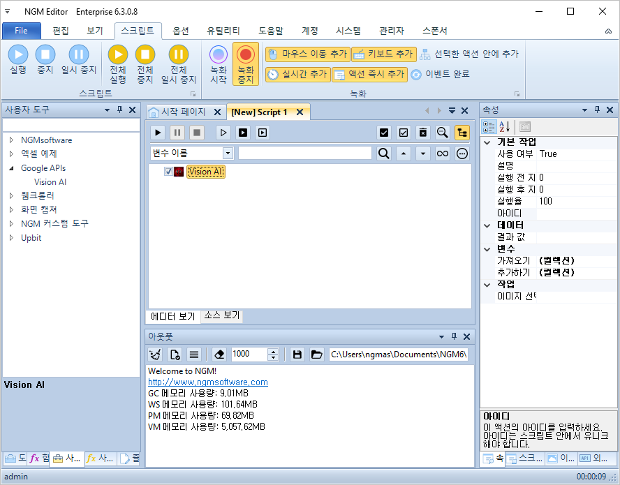 사용자 도구에 보면 Google APIs 카테고리가 생성되고, Vision AI 액션이 추가된 것을 확인할 수 있습니다. 스크립트에 드래그하여 추가 하세요.