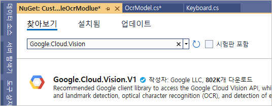 "Google.Cloud.Vision"을 검색하고, 설치 해주세요. 우측에 설치 버튼을 누르면 됩니다.
