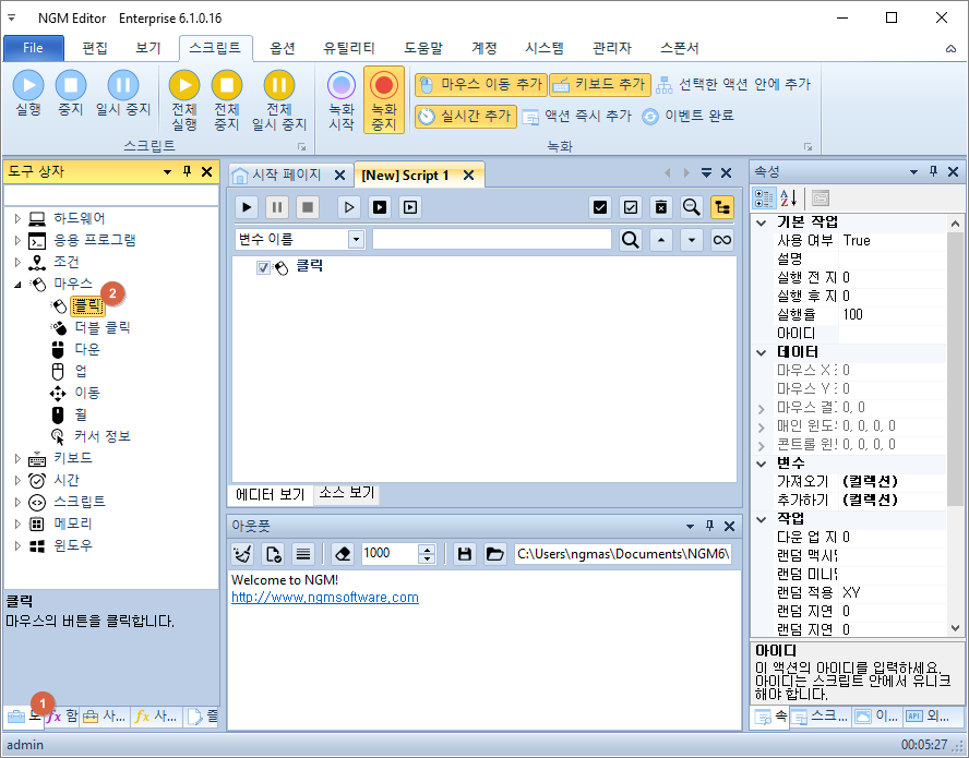 ① 도구 상자 > ② 마우스 > 클릭을 더블 클릭하여 스크립트에 추가합니다.