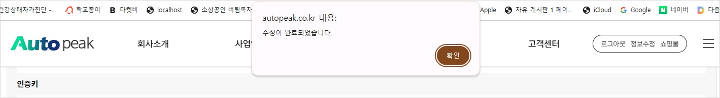 수정이 완료되었습니다. 메세지가 표시됩니다. 확인 버튼을 클릭하세요.