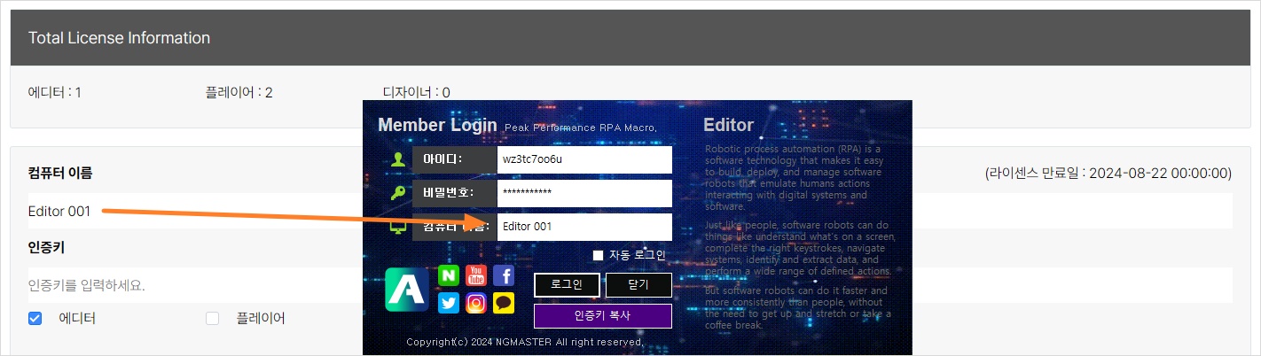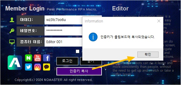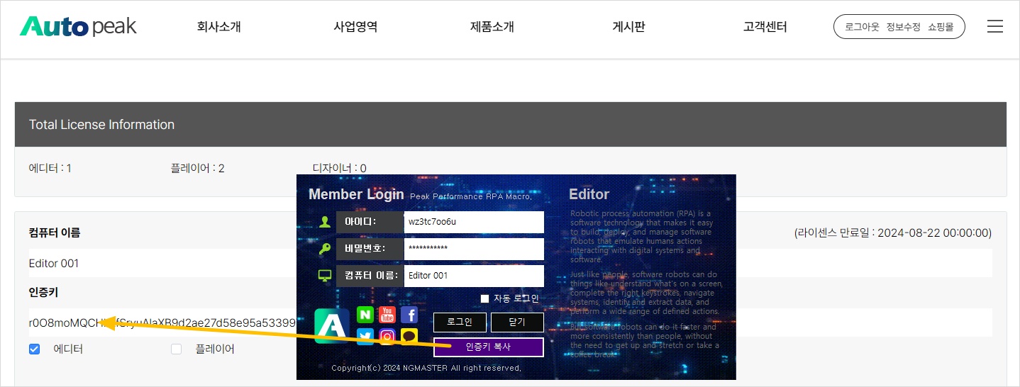 오토픽 에디터 로그인창에서 인증키 복사 버튼을 클릭하세요. 윈도우 클립보드에 랜덤하게 생성된 인증키가 복사됩니다.