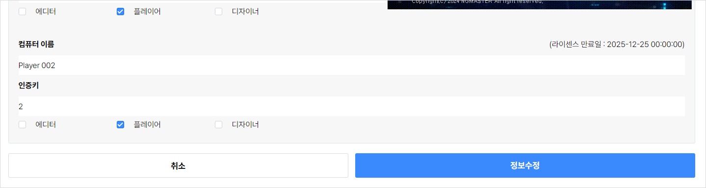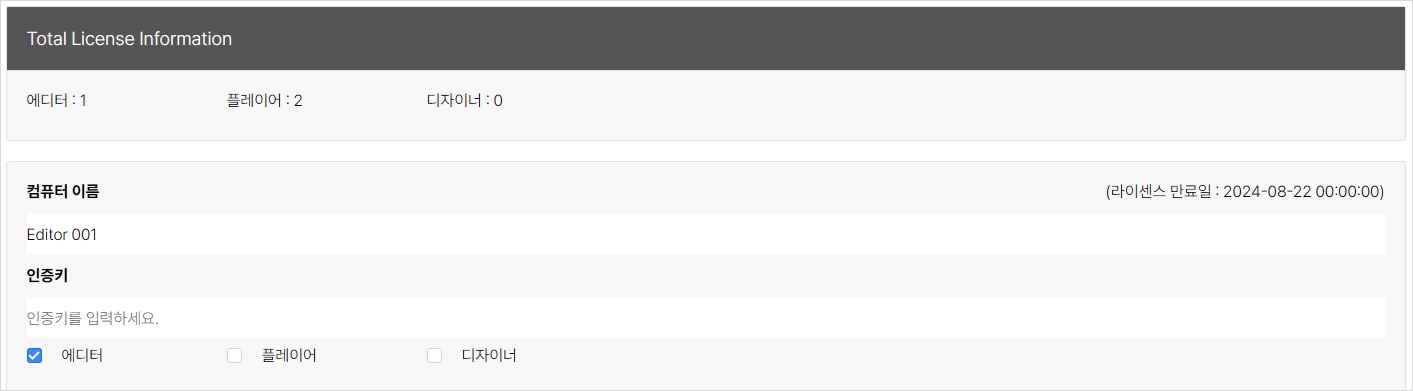 구매한 라이센스 목록이 표시됩니다. 아래 예시는 에디터 1개와 플레이어 2개 라이센스가 추가되어 있는 상태입니다. 그리고, 자동으로 컴퓨터 이름이 생성됩니다. 하지만, 인증키는 직접 추가해야 합니다. 또한, 구매한 라이센스가 에디터인지 플레이어인지 하단의 체크박스로 확인할 수 있습니다.