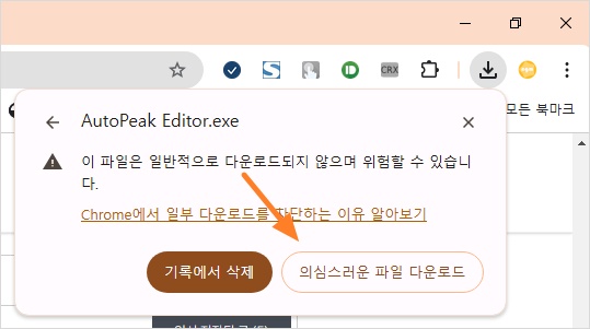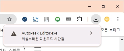 또는 아래와 같이 의심스러운 다운로드 차단됨 경고창이 표시될수도 있습니다. 이런 경우에는 오른쪽 방향 아이콘을 클릭하세요.