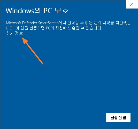 윈도우의 UAC를 사용하면 아래와 같이 Windows의 PC 보호 경고창이 표시됩니다. 추가 정보를 클릭하세요.