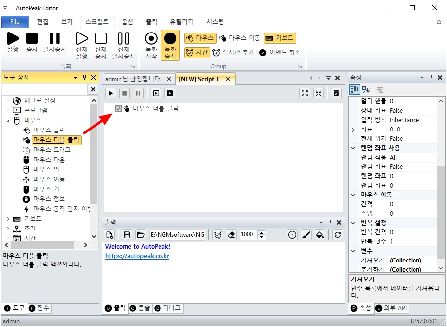 오토픽 에디터를 실행하고, 도구 상자의 마우스 더블 클릭 액션을 스크립트에 추가하세요.