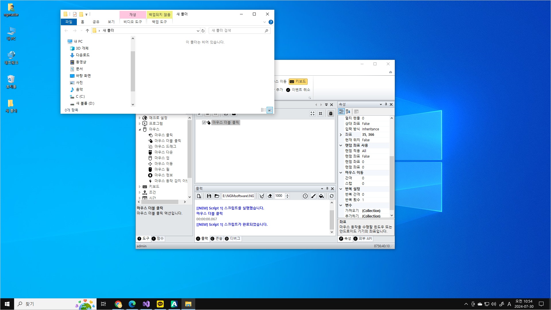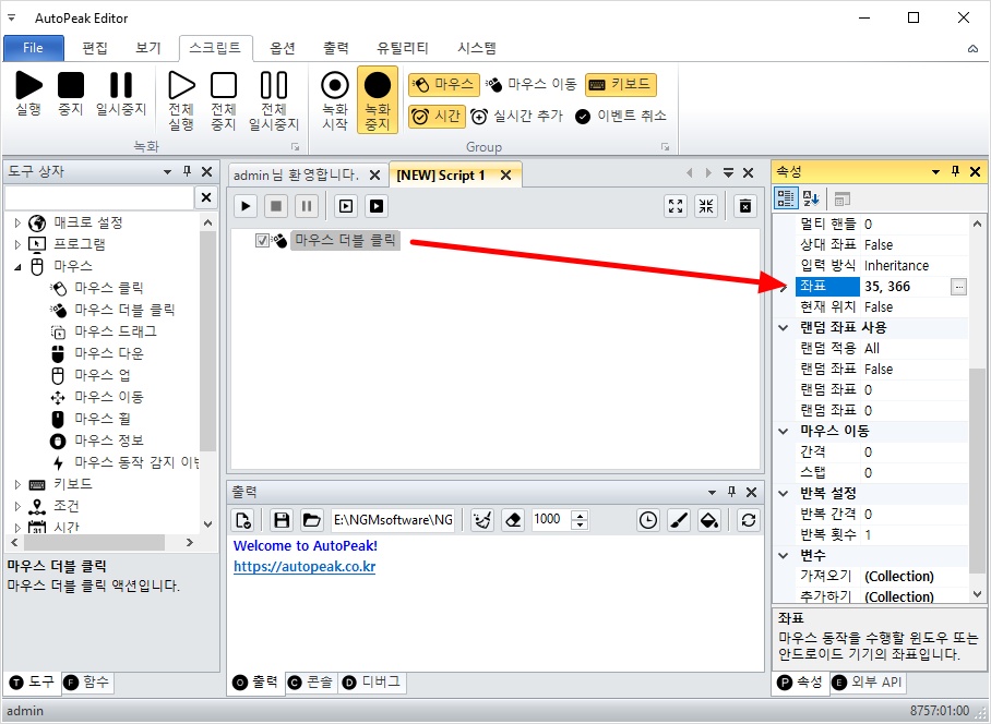 새 폴더를 더블 클릭하면 폴더가 열릴겁니다. 마우스 더블 클릭 액션을 선택하고, 오른쪽의 속성창에서 좌표를 설정합니다.