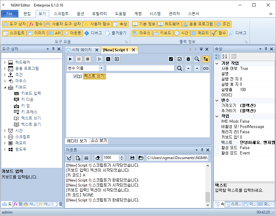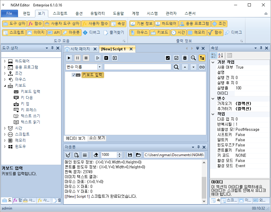 그리고 오토픽 에디터에서 **새 스크립트(Ctrl+N)**를 추가한 후, 키보드 입력 액션을 넣어주세요.