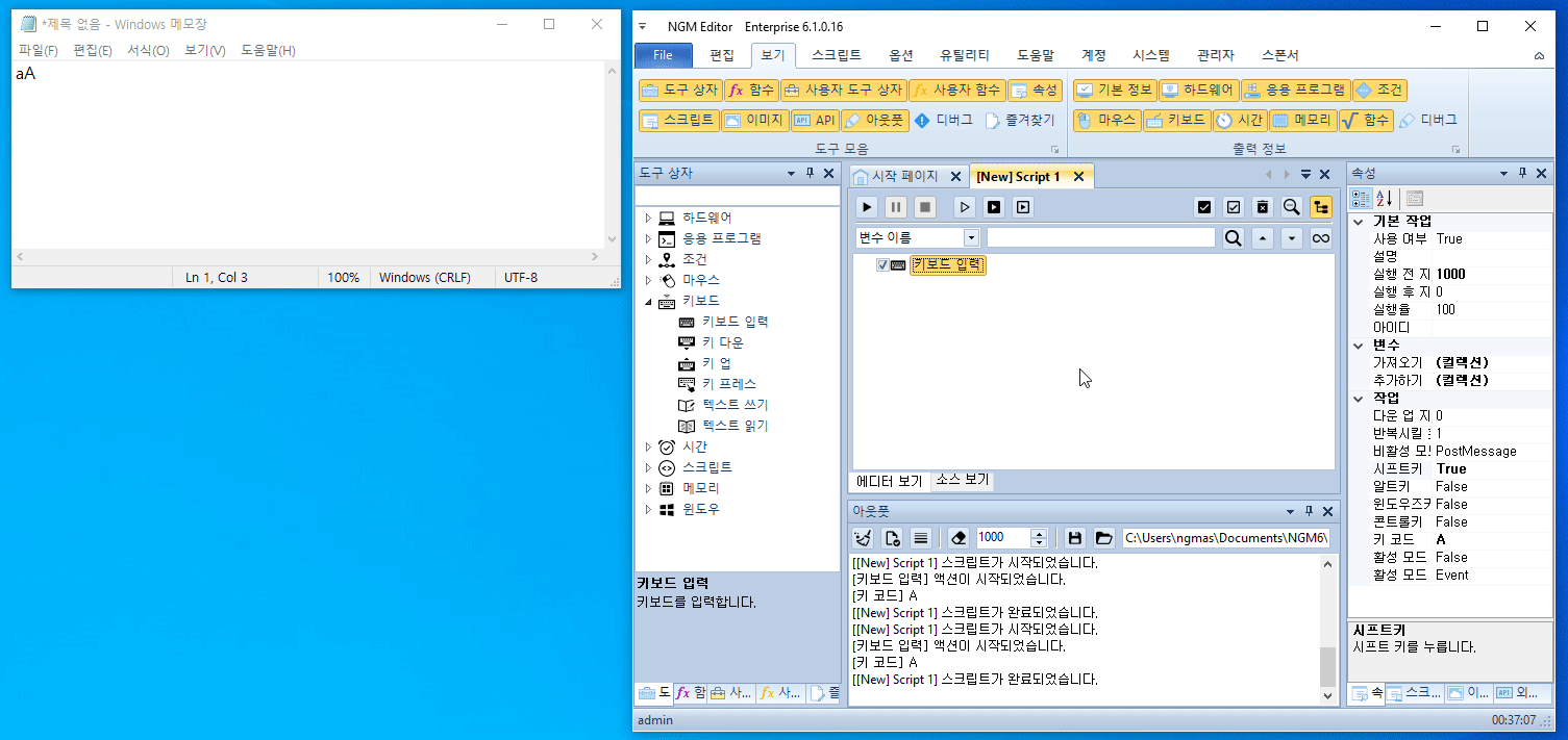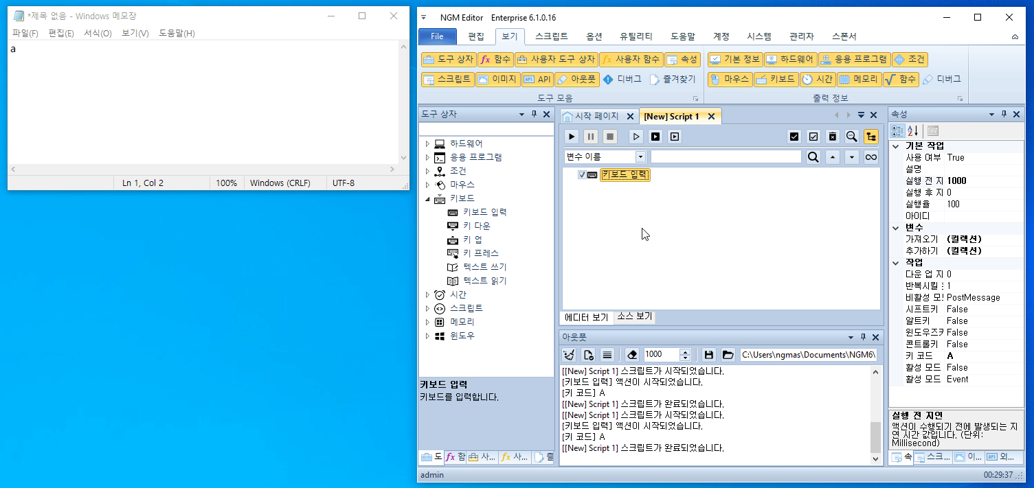 그 사이에 직접 메모장을 클릭해 활성화시킨 후 키보드 액션이 실행되면, 메모장에 "a" 문자가 입력됩니다.