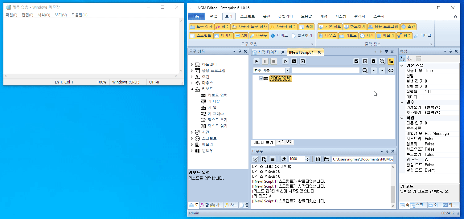 왜 이런 결과가 나오는걸까요? 키보드는 마우스와 다르게 비주얼적으로 확인할 수 있는게 없습니다. 마우스 포인터처럼 움직이는게 없다는 뜻이죠. 텍스트가 입력되어야만 동작을 확인할 수 있습니다. 또 한가지 중요한점은 텍스트를 입력받을 Input 컨트롤이 존재해야 한다는 겁니다. 대표적인 프로그램이 메모장(Notepad)입니다. 테스트를 위해서 약간의 지연 시간을 주고 키보드 액션이 동작하기 전에 메모장을 직접 클릭해서 활성화 시켜보세요.