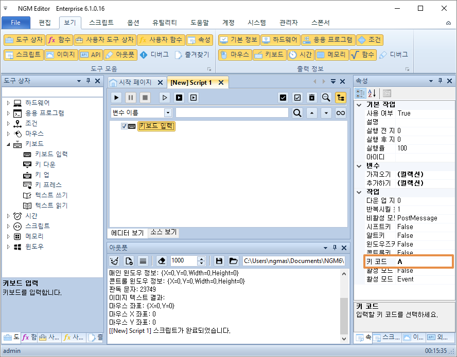 예시로 "키 코드" 속성에 A를 입력해봅니다.