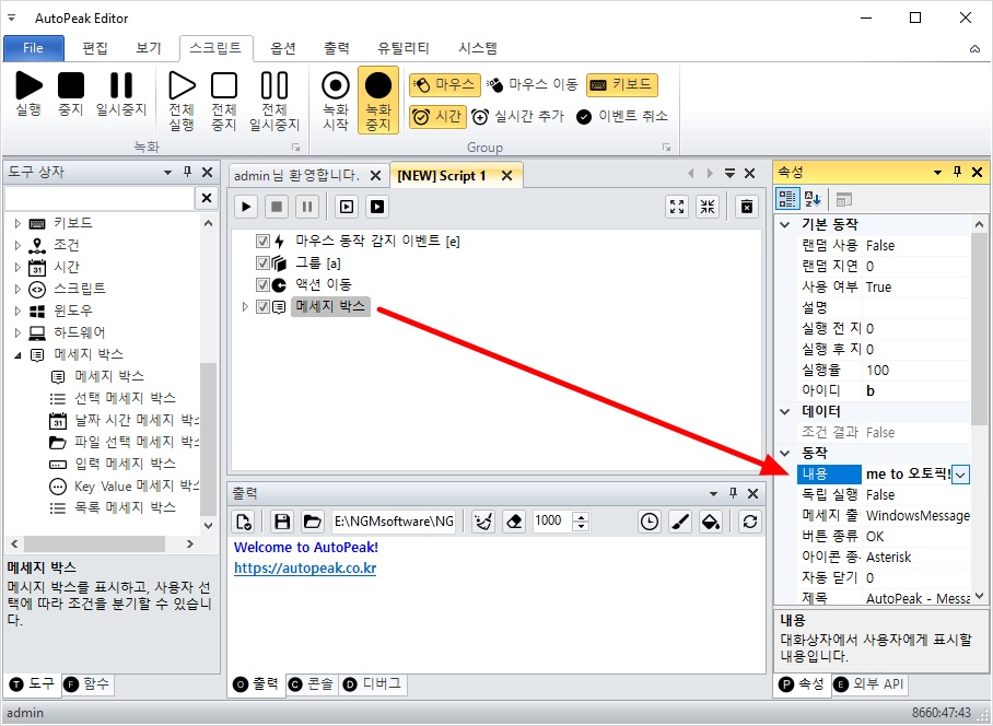 메세지 박스 액션을 선택하고, 내용도 추가 해줍니다.