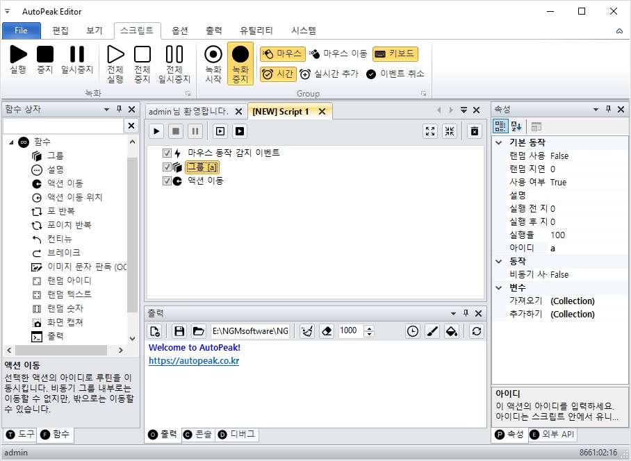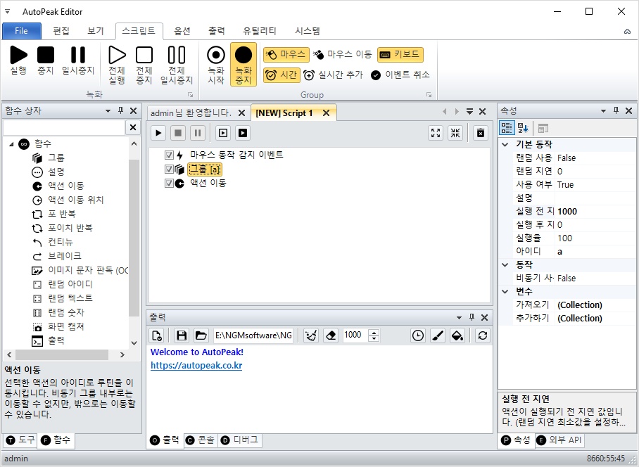 따라서, 마우스 동작 감지 이벤트가 시스템에 등록되고 그룹 a 액션이 실행됩니다.