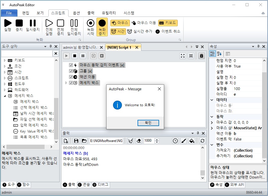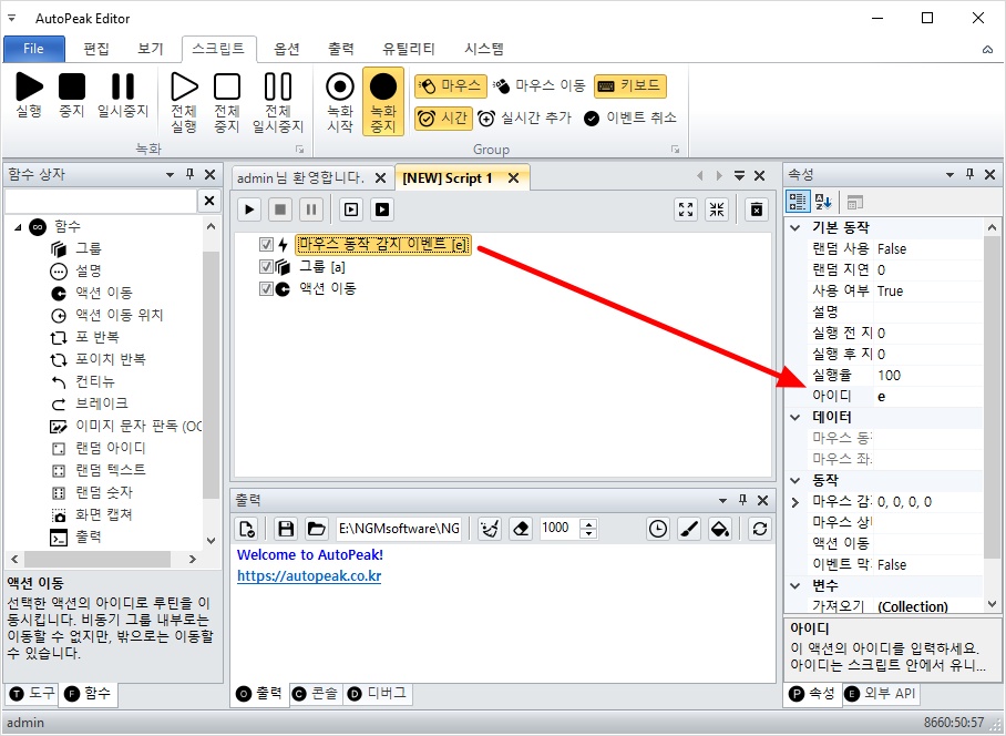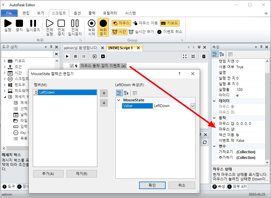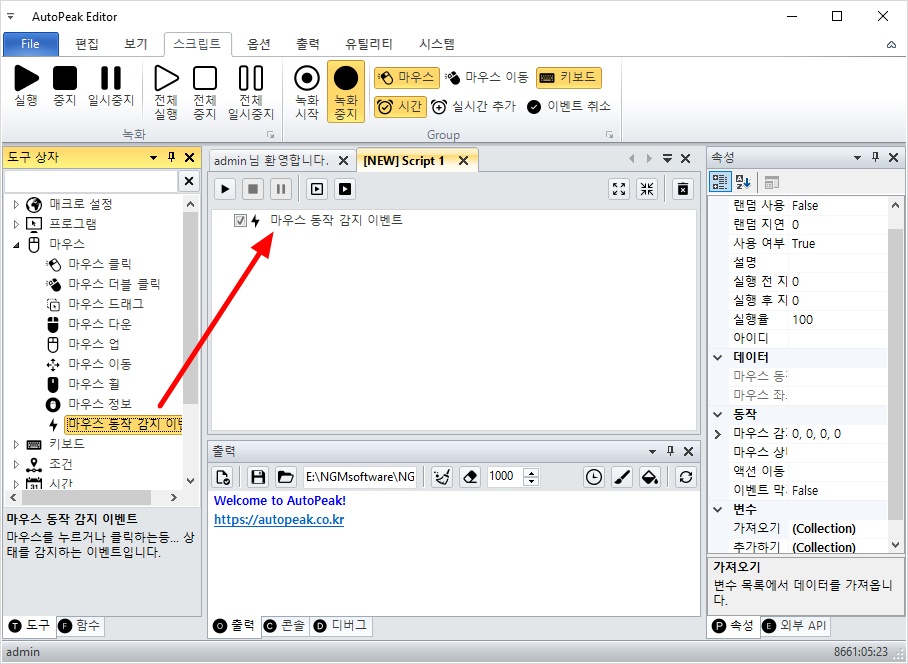 오토픽 에디터를 실행하고, 좌측 도구 상자에서 마우스 카테고리를 확장하세요. 그리고, 마우스 동작 감지 이벤트를 더블 클릭해서 스크립트에 추가하세요.