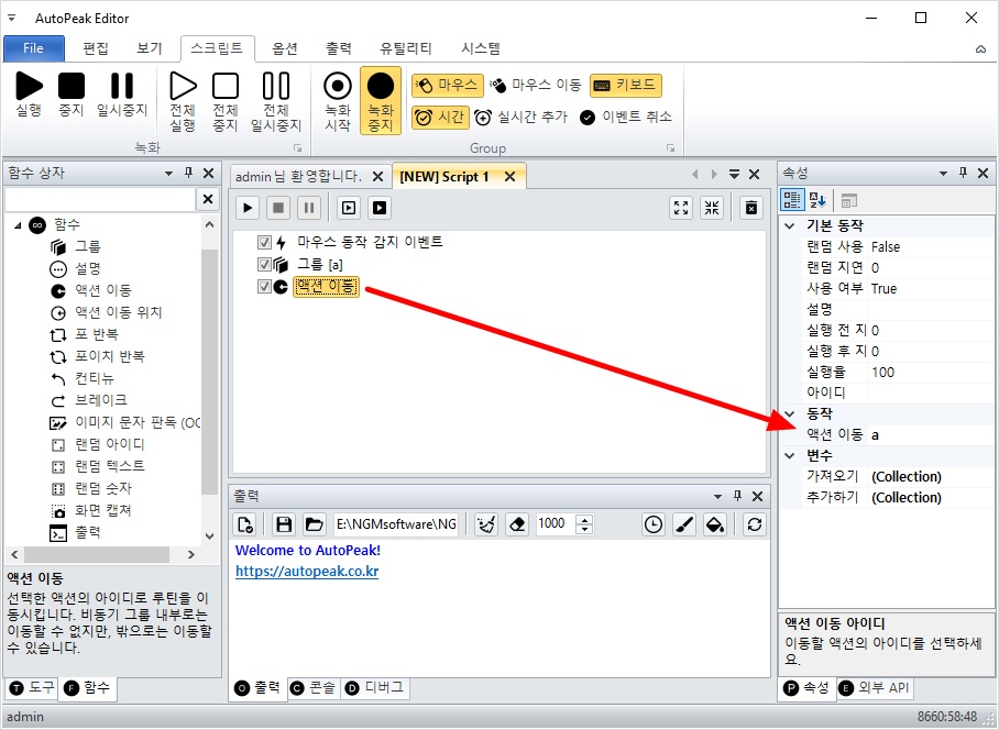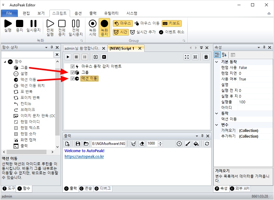 그룹과 액션 이동은 에디터 좌측의 함수 상자의 함수 카테고리에 들어 있습니다.