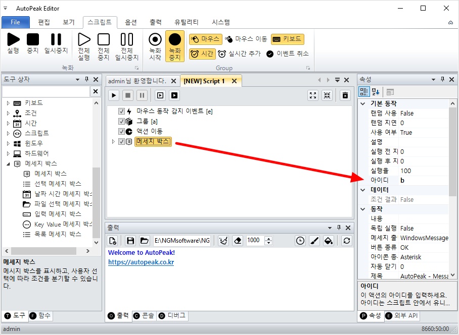 이벤트가 정상적으로 발생하는지 확인하기 위해 아래와 같이 메세지 박스를 하나 추가하겠습니다.