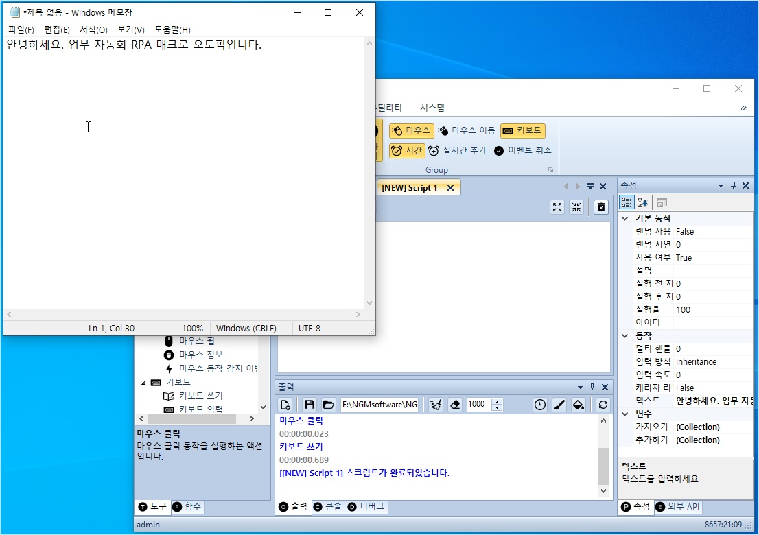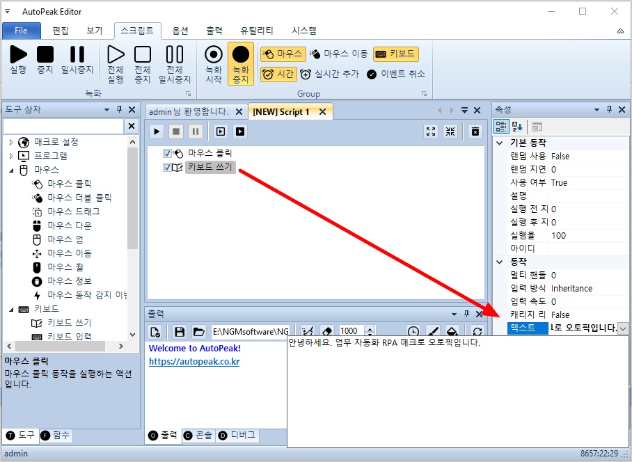 키보드 쓰기 액션을 선택하고, 우측 속성창에서 텍스트에 "안녕하세요. 업무 자동화 RPA 매크로 오토픽입니다." 내용을 입력하세요.