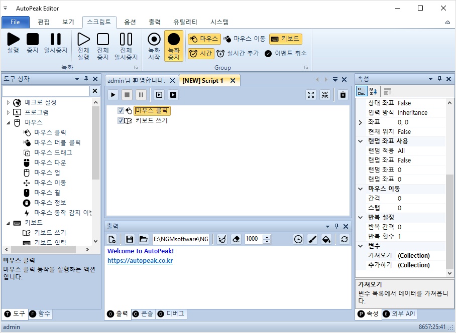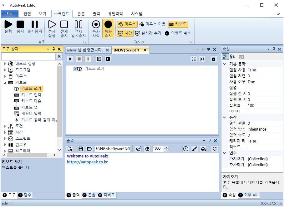 키보드 쓰기 액션을 더블 클릭하면 새로운 스크립트가 자동으로 만들어지고 액션이 추가됩니다.