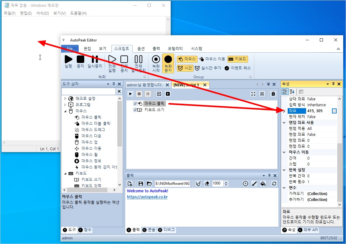 메모장으로 마우스를 이동한 후 F1을 눌러서 클릭 좌표를 고정시키세요.