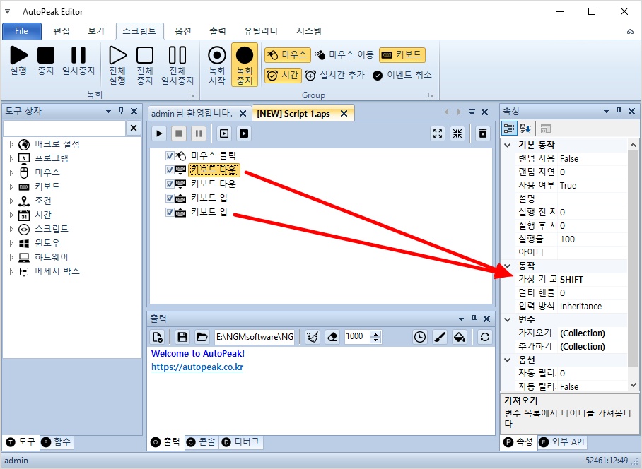 두번째 액션과 마지막 액션의 가상 키 코드를 SHIFT로 설정 해주세요.