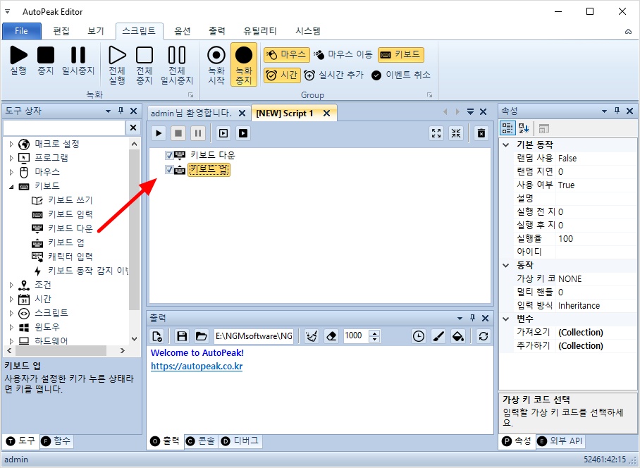 키보드 다운과 키보드 업 액션을 각각 더블 클릭해서 스크립트에 추가 해주세요.