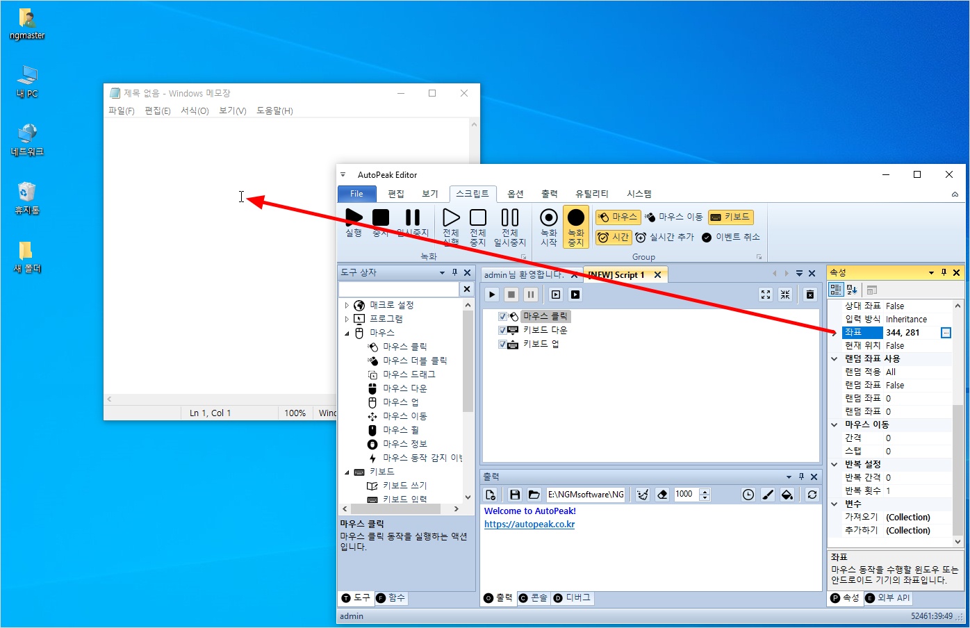 그리고, 아래 그림과 같이 마우스 클릭 액션의 우측 속성창에서 좌표 속성을 클릭한 후 메모장으로 설정하세요.
