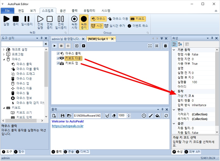 키보드 다운과 키보드 업의 가상 키 코드를 A로 선택하세요.