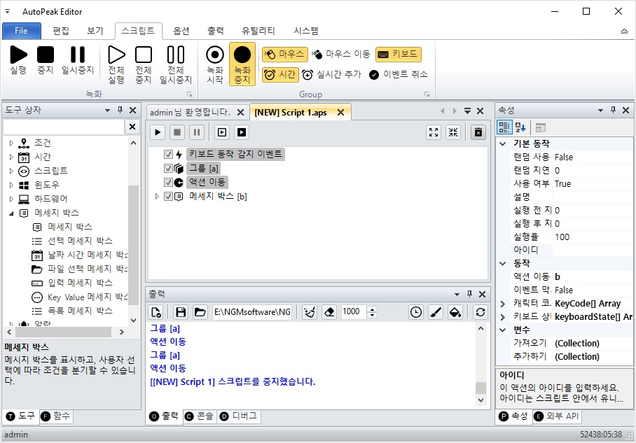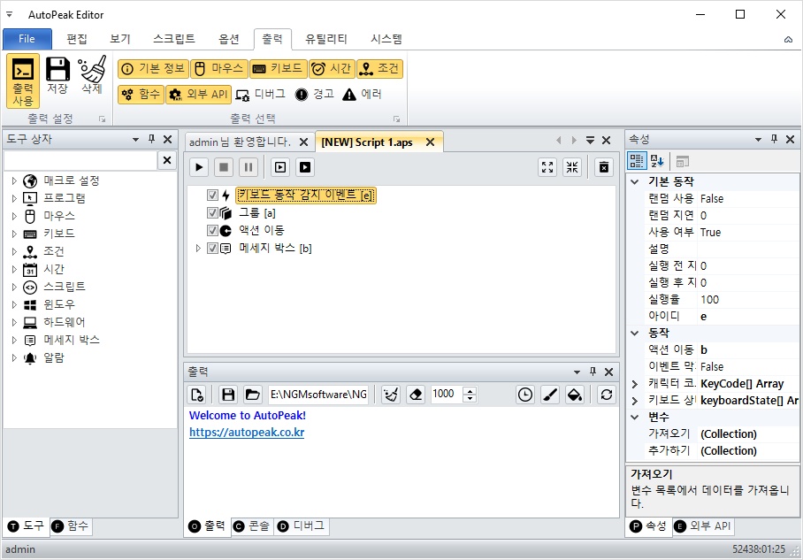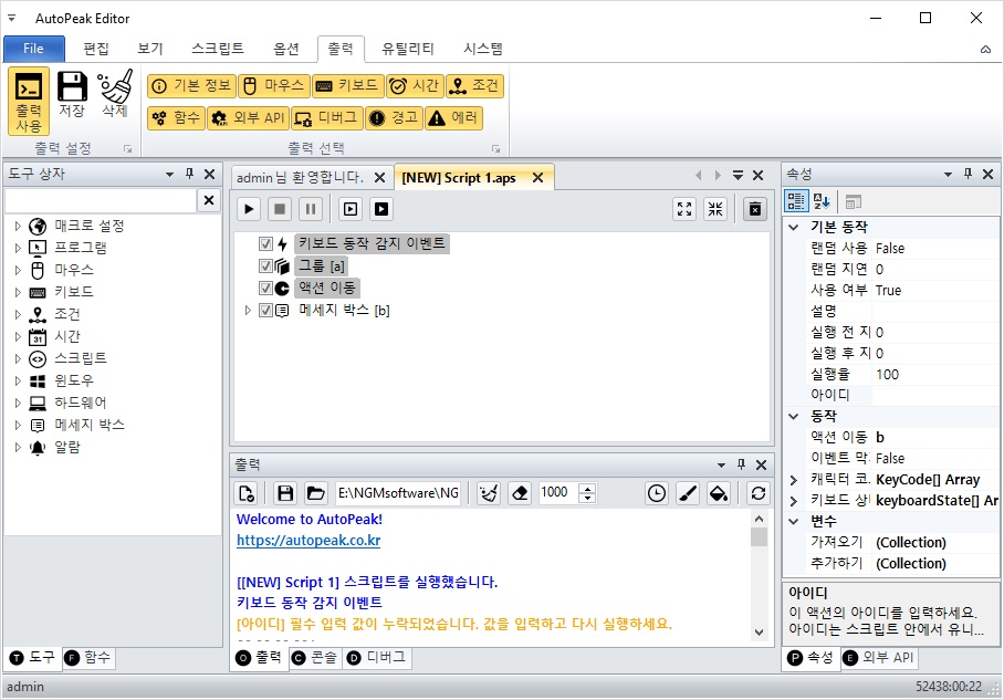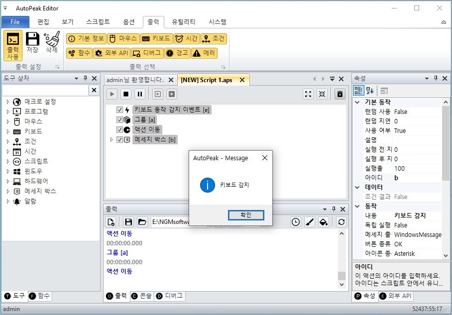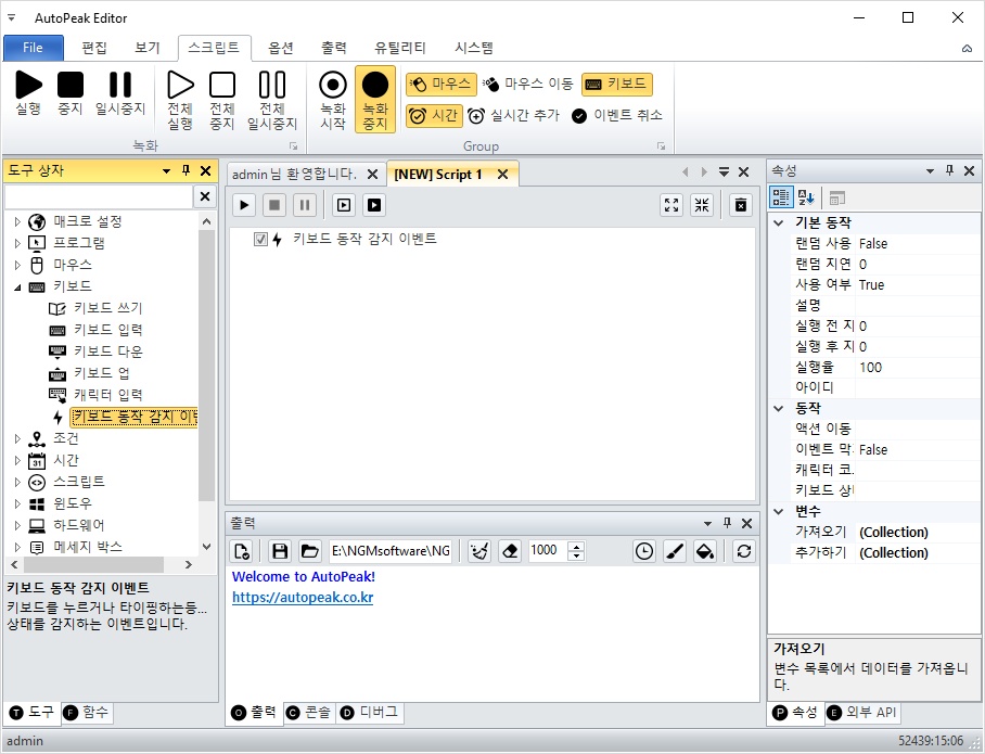 이 내용을 테스트 하기위해 오토픽 에디터를 실행하고, 도구 상자에서 키보드 카테고리의 키보드 동작 감지 이벤트를 더블 클릭하세요.