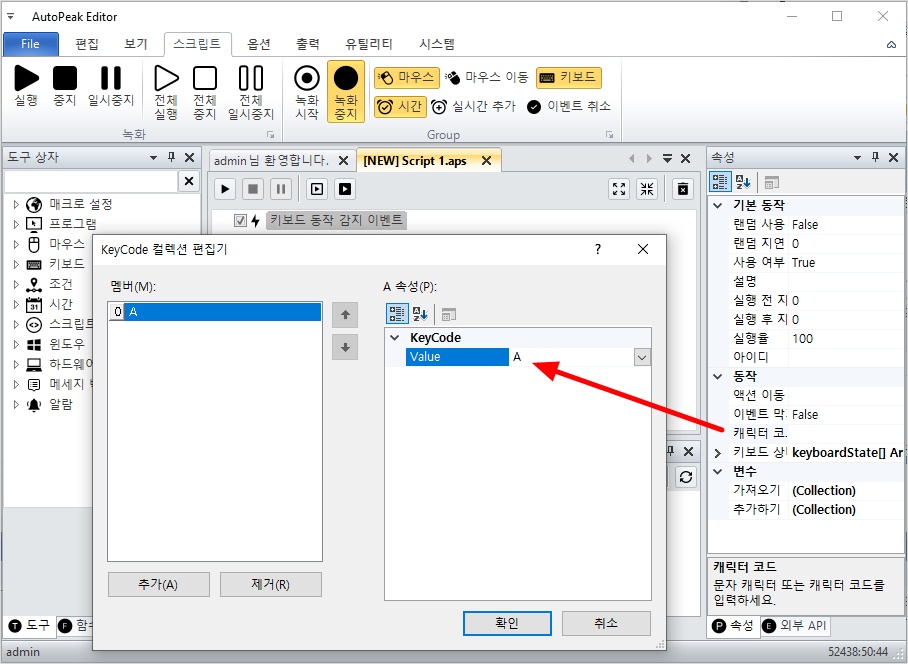 감지할 키를 추가해야 하는데요. 우측 속성창에서 캐릭터 코드를 클릭하세요. 그리고, 아래와 같이 A키를 하나 추가 해줍니다.
