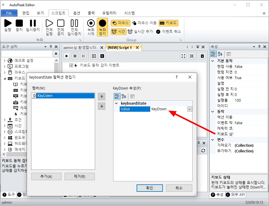 스크립트에 추가된 키보드 동작 감지 이벤트 액션을 선택하고, 우측의 속성창에서 키보드 상태를 클릭하세요.