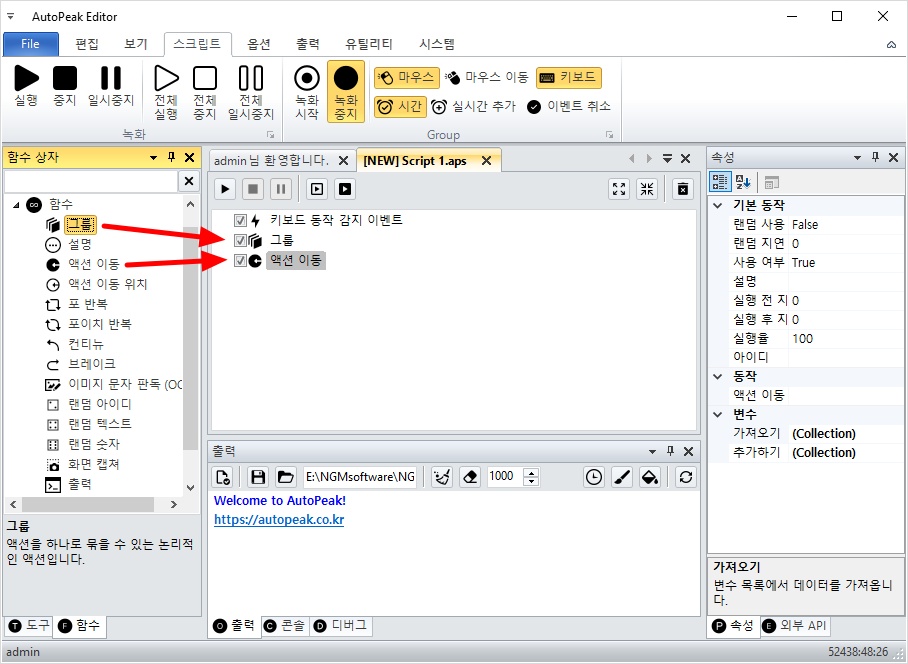 두번째 그룹 a액션이 실행되고, 세번째 액션 이동이 실행되는데요.