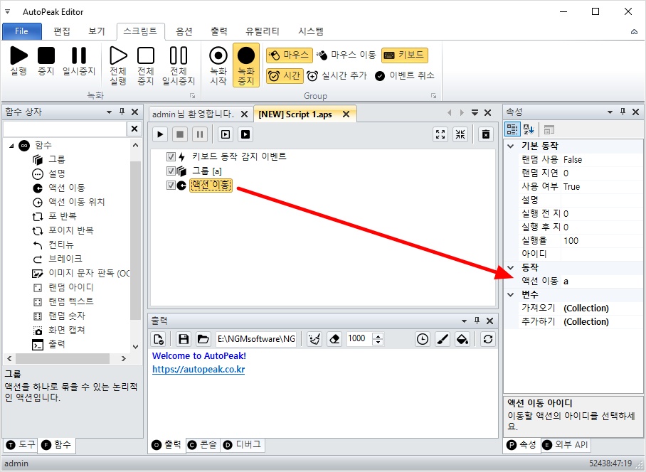 그룹 액션의 아이디는 a로 설정해줍니다. 그리고, 액션 이동의 액션 이동 아이디 속성에서 a를 선택하세요.