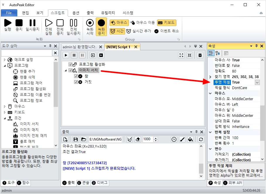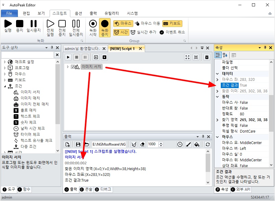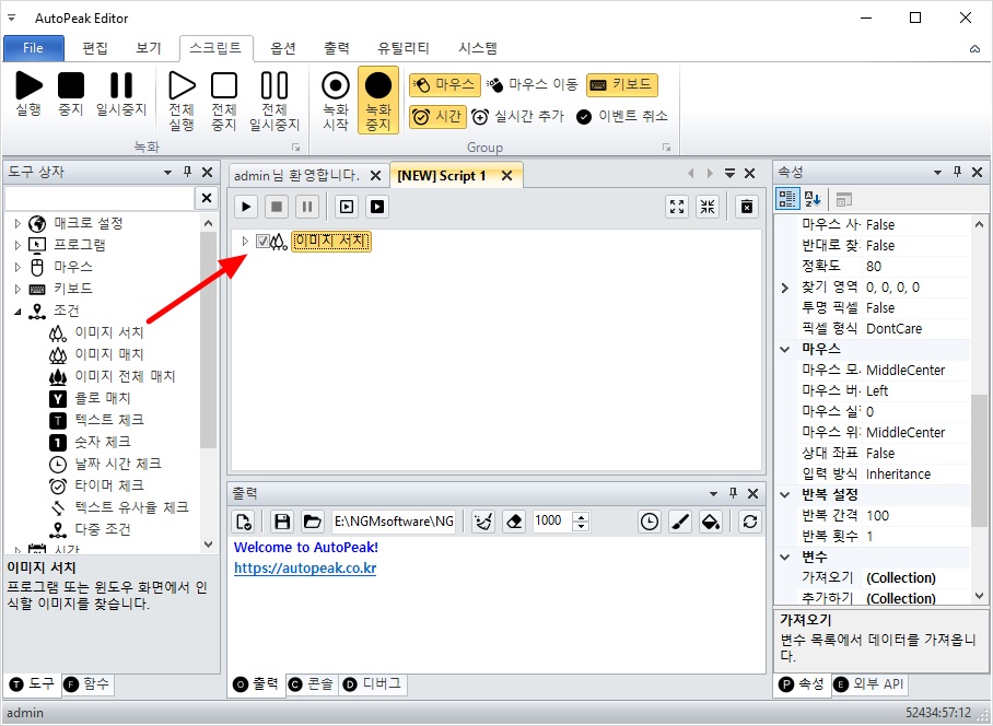 이미지 서치가 무엇인지 알아보기 위해 오토픽 에디터를 실행하고, 왼쪽 하단의 도구 상자에서 조건 카테고리의 이미지 서치 액션을 더블 클릭하세요.