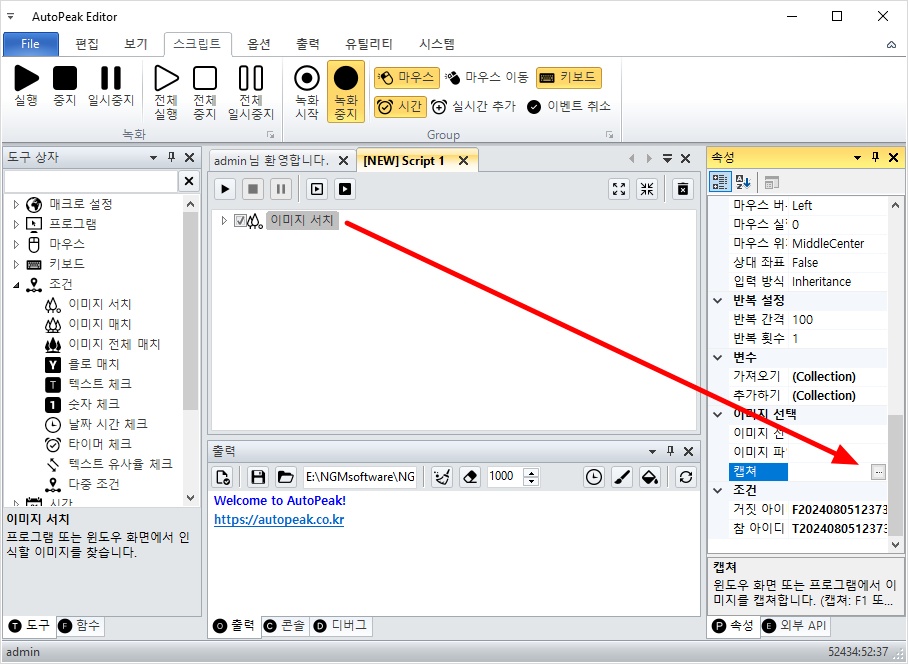 오토픽 에디터에서 이미지 서치 액션을 선택하고 우측의 속성창에 캡쳐 버튼을 클릭하세요.