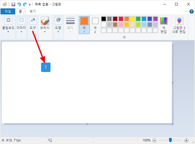 그림판의 도구에서 페인트를 선택하고, 숫자 1의 흰색을 클릭하세요. 그러면, 흰색 부분만 오랜지색으로 채워집니다.