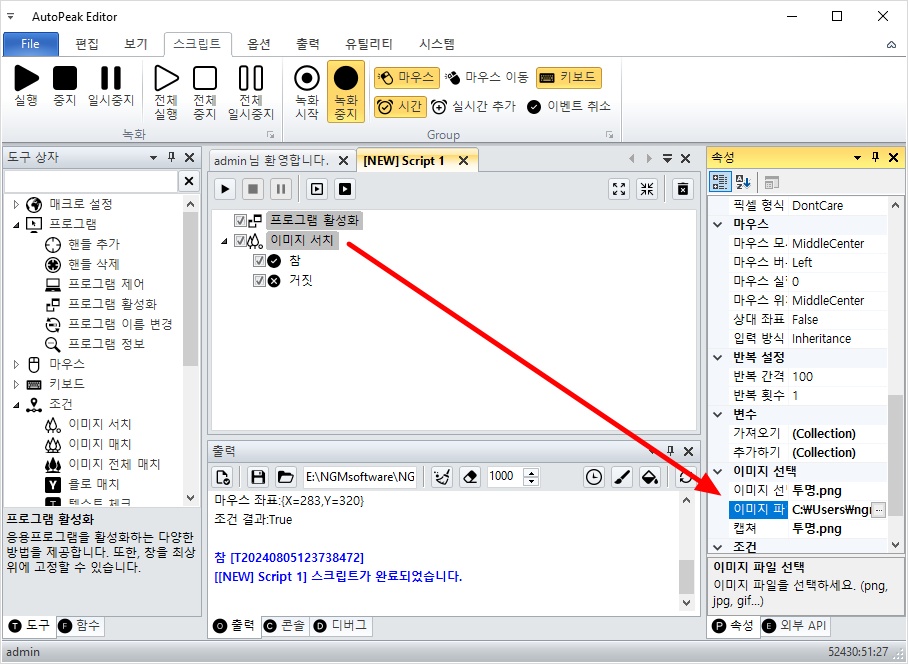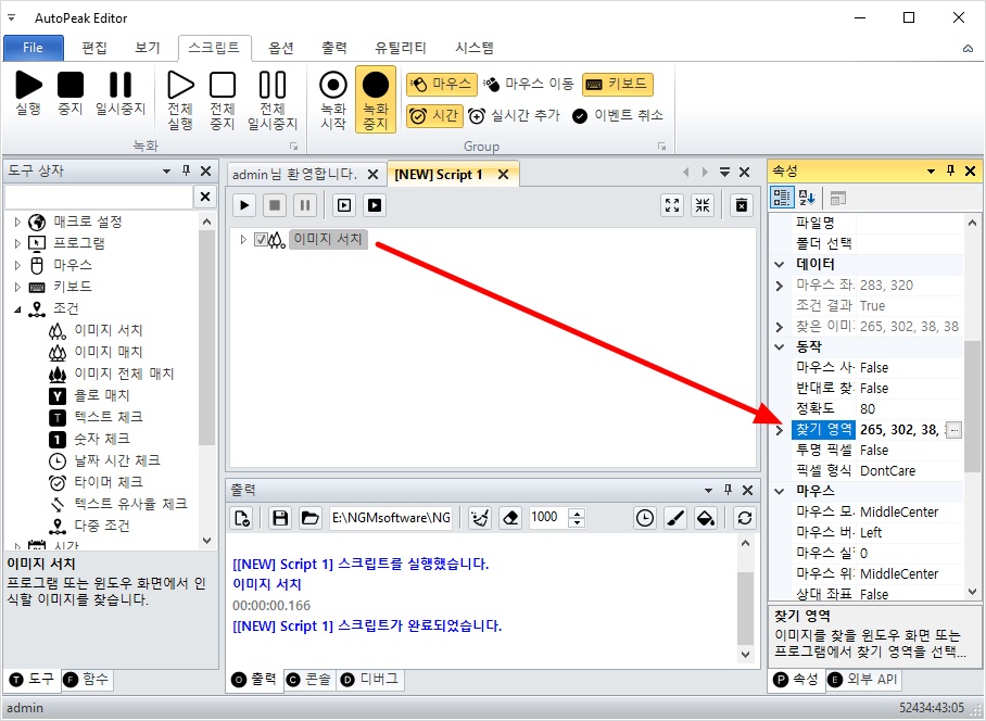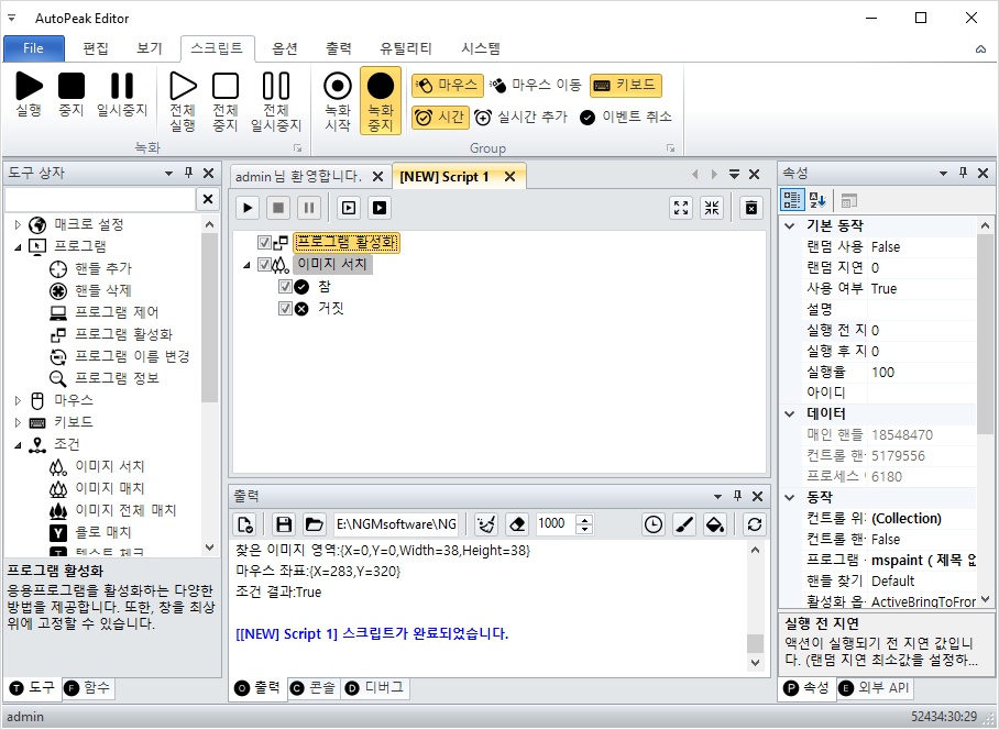 이미지 서치 액션을 더블 클릭하면 새로운 스크립트가 생성되고, 자동으로 액션이 추가됩니다.