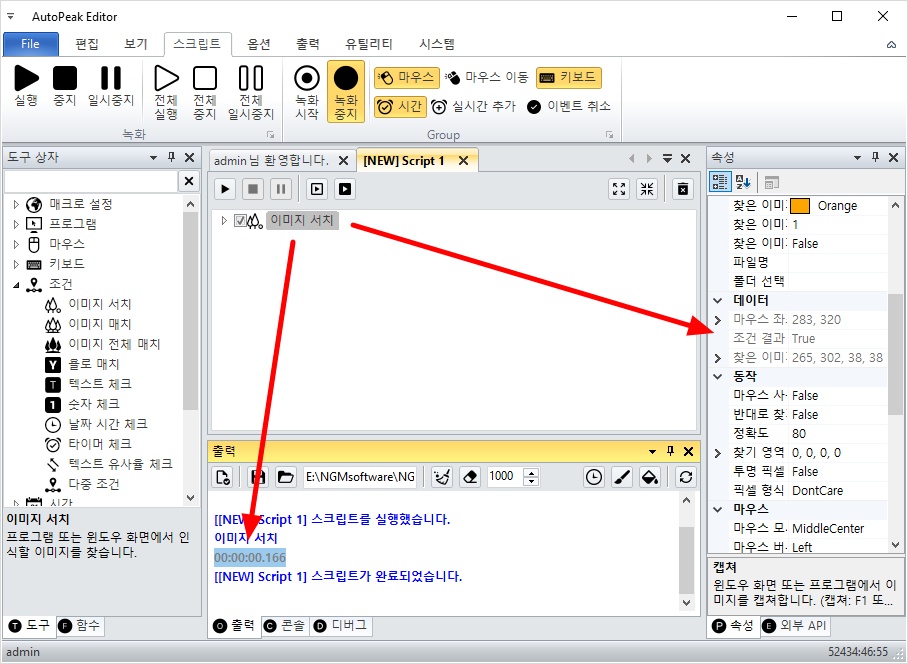 완성된 테스트 스크립트를 실행 해볼까요? 아래와 같이 하단 아웃풋 창에는 이미지를 찾는데까지 걸린 시간이 표시됩니다.